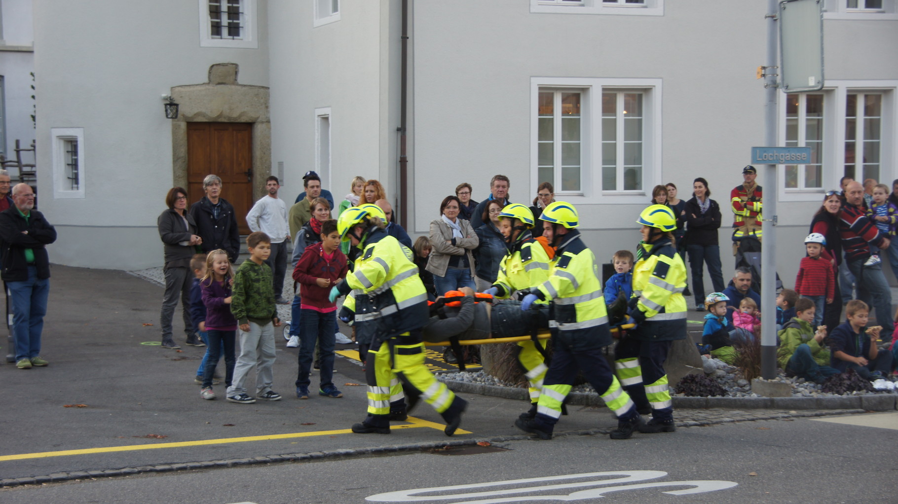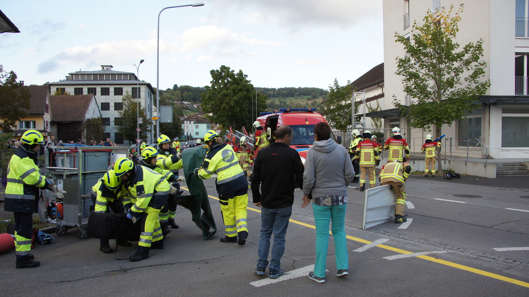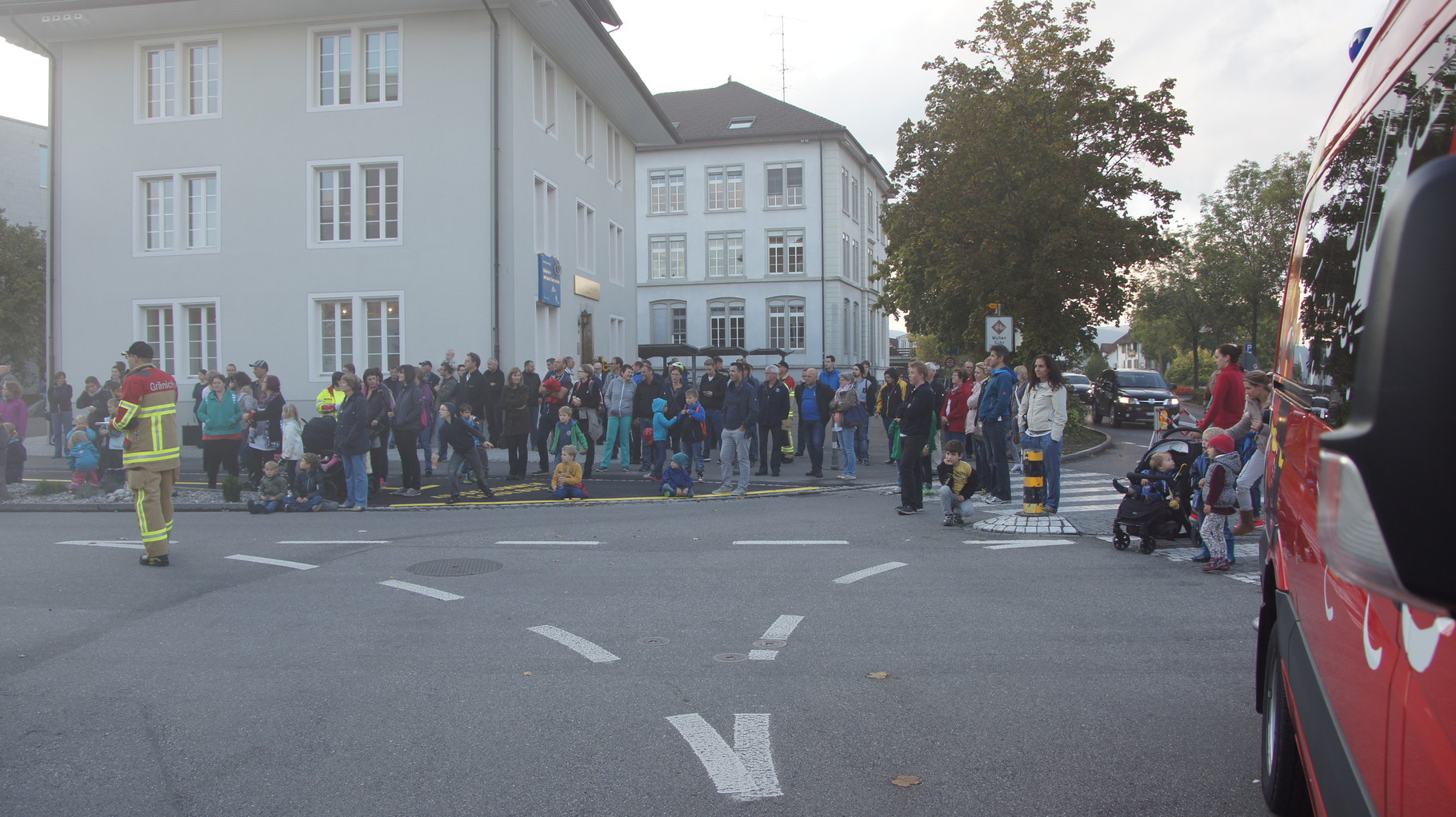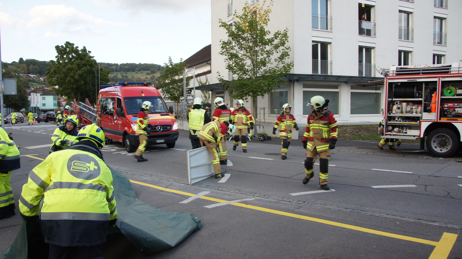 Sofort rückten die Einsatzkräfte mit Blaulicht und Horn zum Schadenplatz aus, wo sie vom interessierten Publikum empfangen wurden. Der Einsatzleiter befahl die ersten Rettungen im zweiten und
