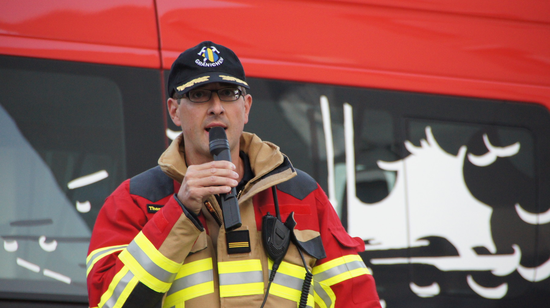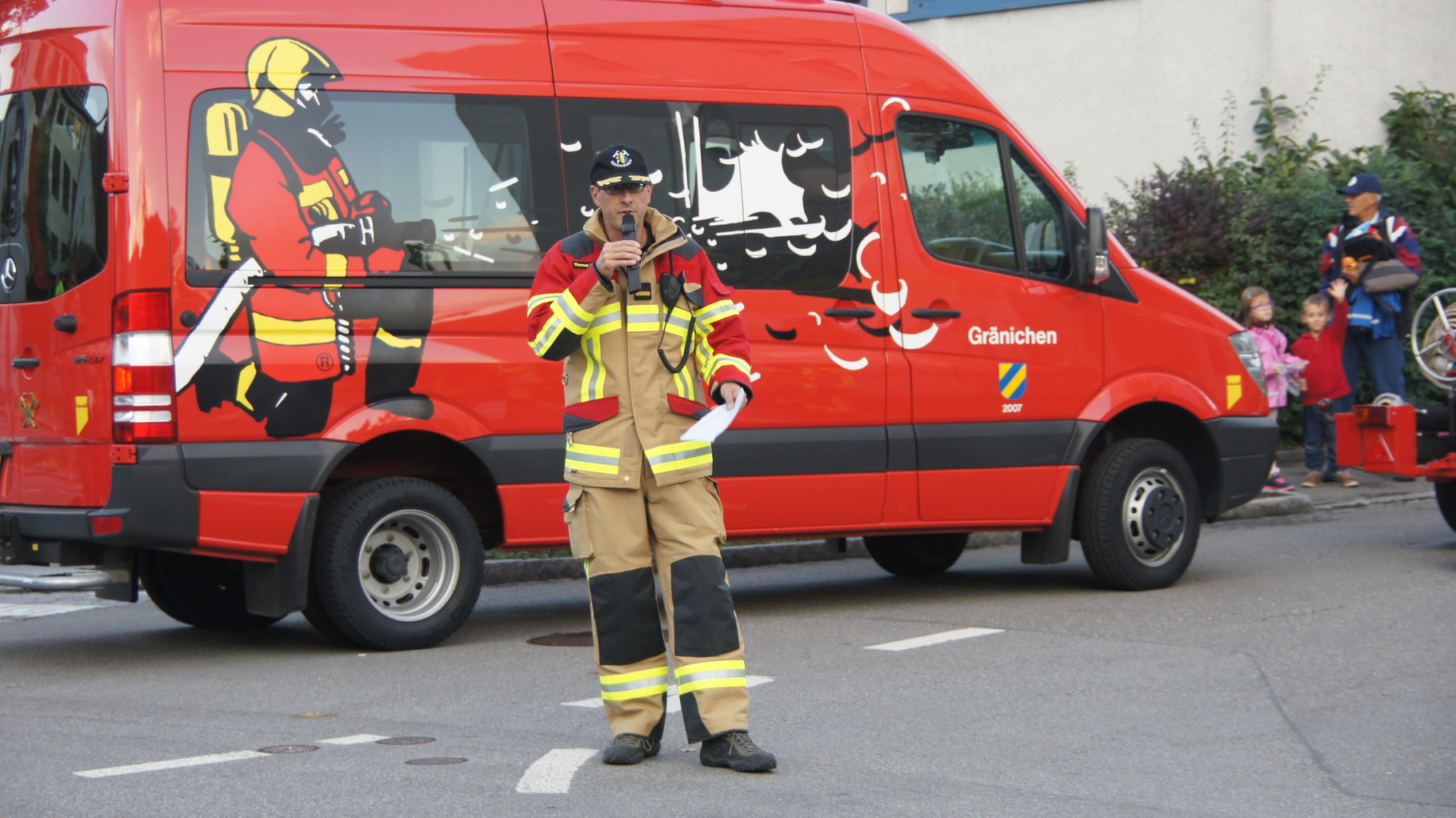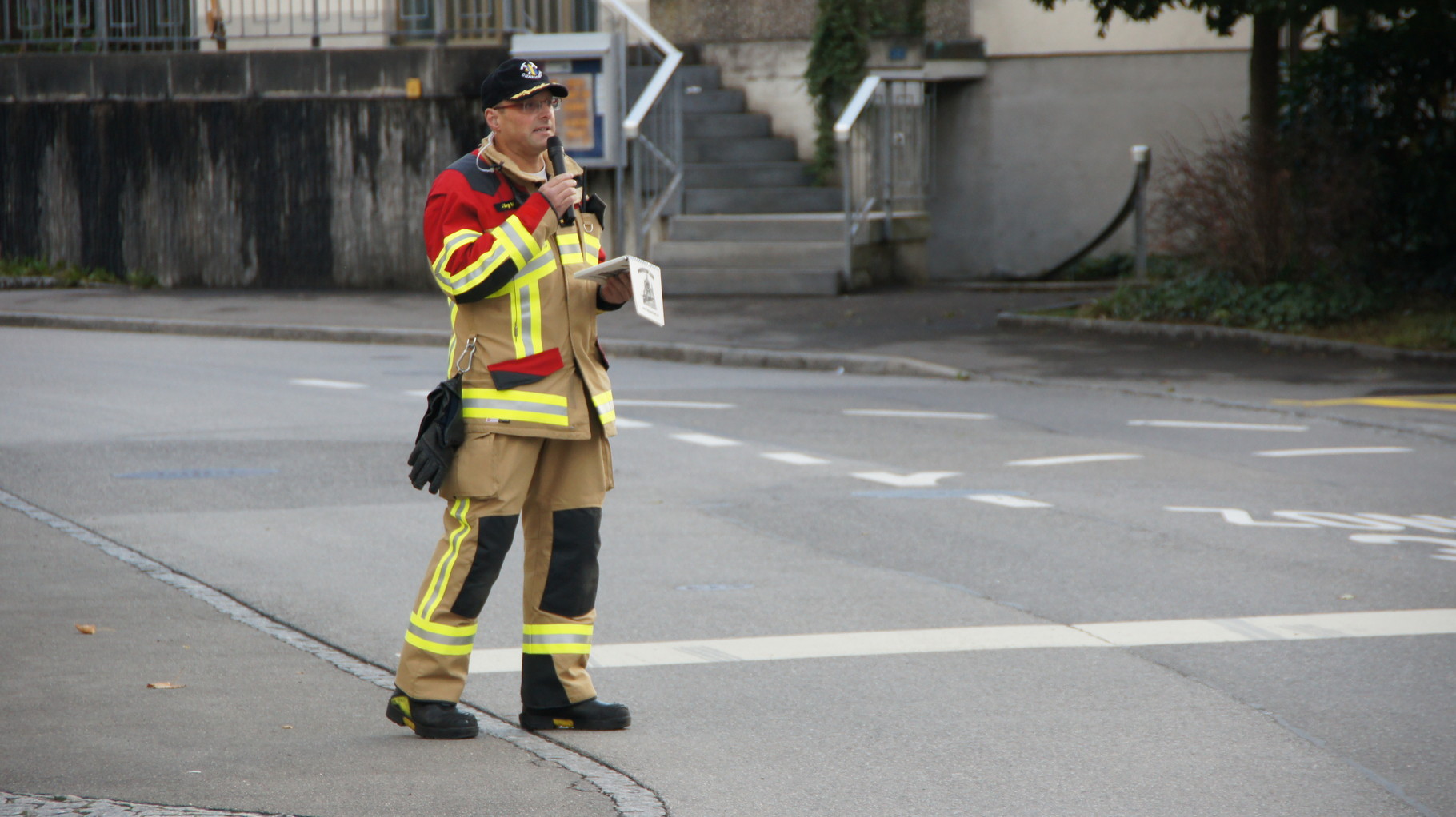 Im Anschluss an die bestandene Übung stellte der Feuerwehrkommandant Thomas Wiederkehr den Zuschauerinnen und Zuschauer die neuen Brandschutzkleider vor. Diese Kleider bieten den Feuerwehrleuten