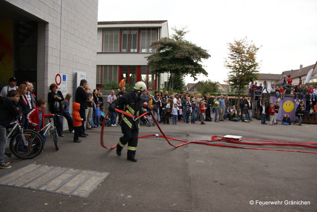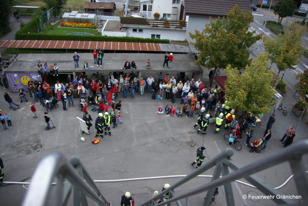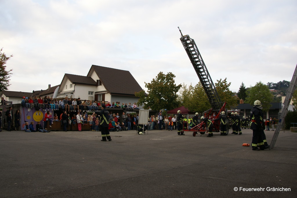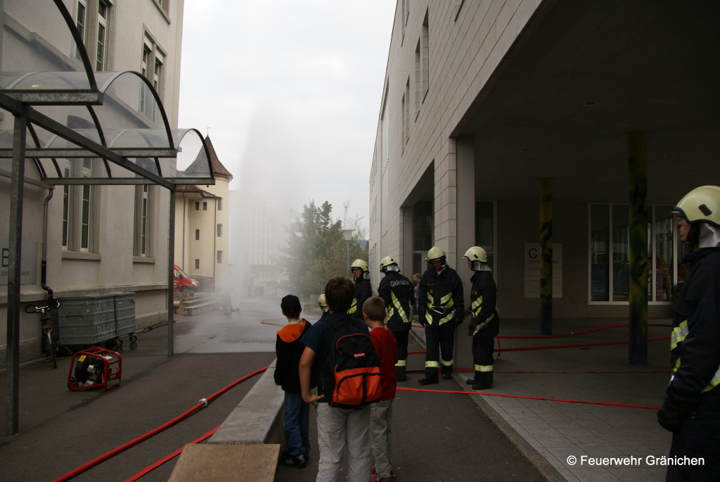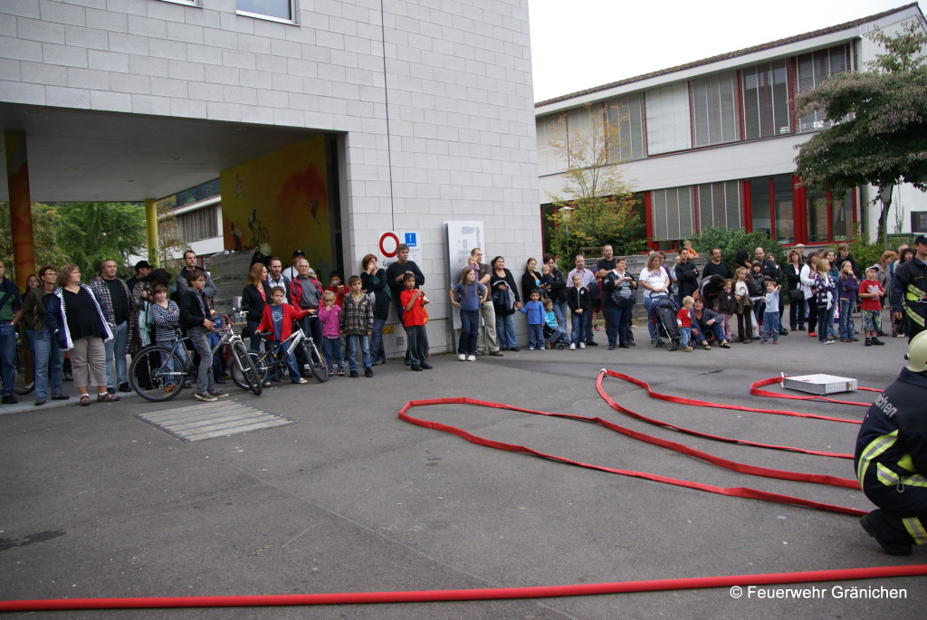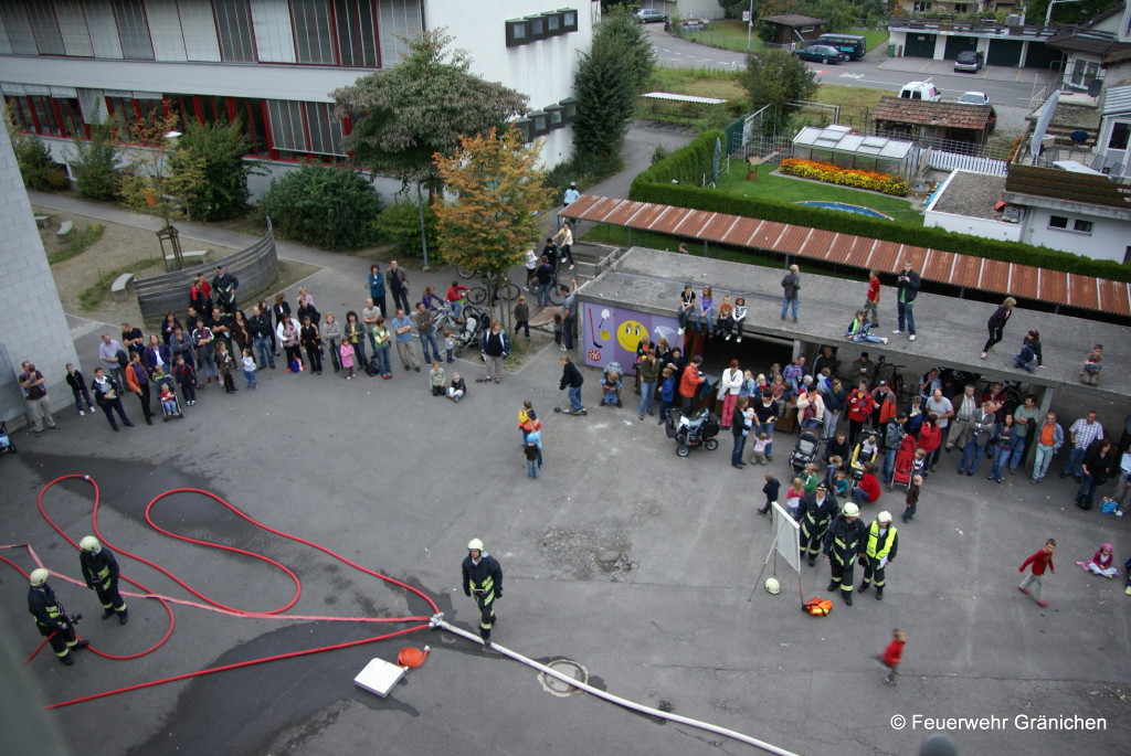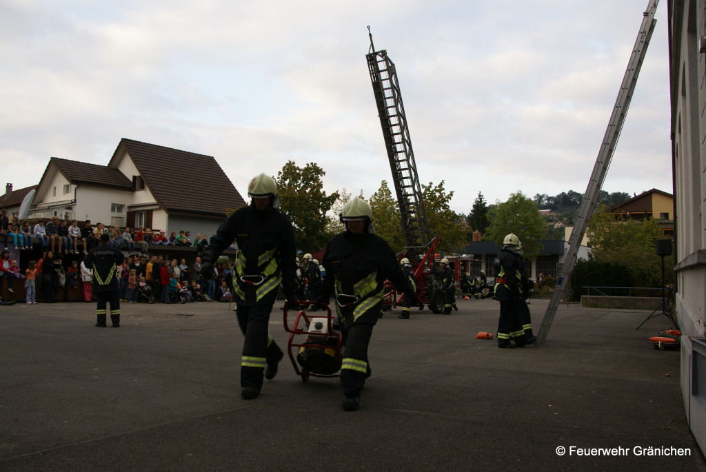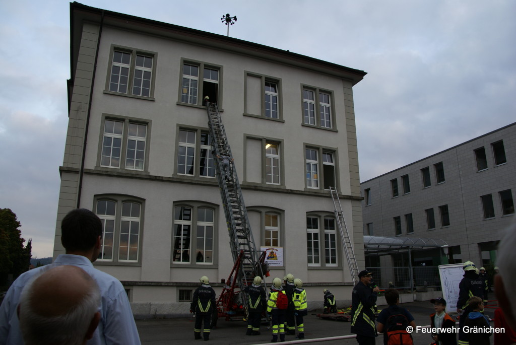 Zuerst wurden die Personen die im Rauch waren mit der 11 Meter langen Schiebeleiter gerettet. Weiter wurde die Schulklasse mit der 22 Meter langen Anhängeleiter mit Motor in Sicherheit gebracht. Alle geretteten Personen kamen anschliessend in das von der Sanitätsgruppe eingerichtete Verwundetennest. Dort wurden sie erstbehandelt und betreut. Derweilen sperrte das Verkehrskorps die Hauptstrasse einseitig ab und regelte den Verkehr. Es wurden mehrere Löschleitungen ab dem Tanklöschfahrzeug (TLF) erstellt und betrieben. Der Lüfter kam ebenfalls zur Rauchbefreiung des Gebäudes zum Einsatz. Zum Schutz von Nachbarliegenschaften setzte der Einsatzleiter das Hydroschild ein. Alle Aktionen wurden vom Speaker Schritt für Schritt erklärt. Die Feuerwehr verteilte den ZuschauerInnen feinen selbst gebackenen Speckzopf und frisch gepressten Apfelsaft.