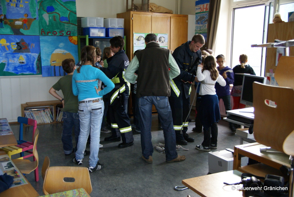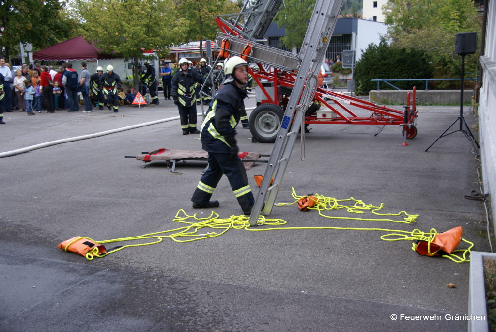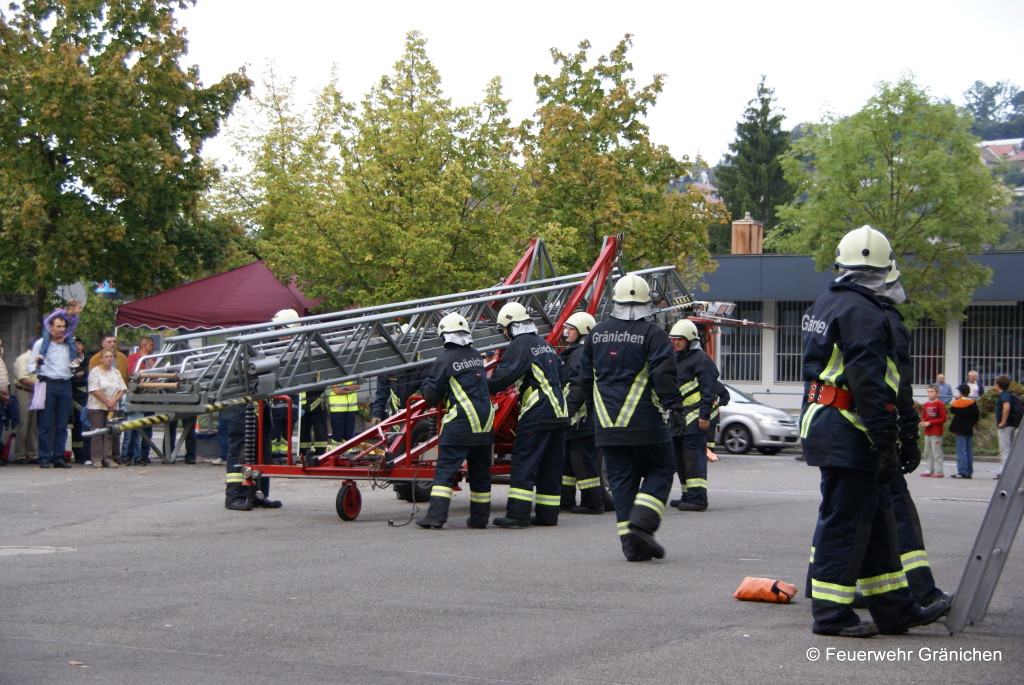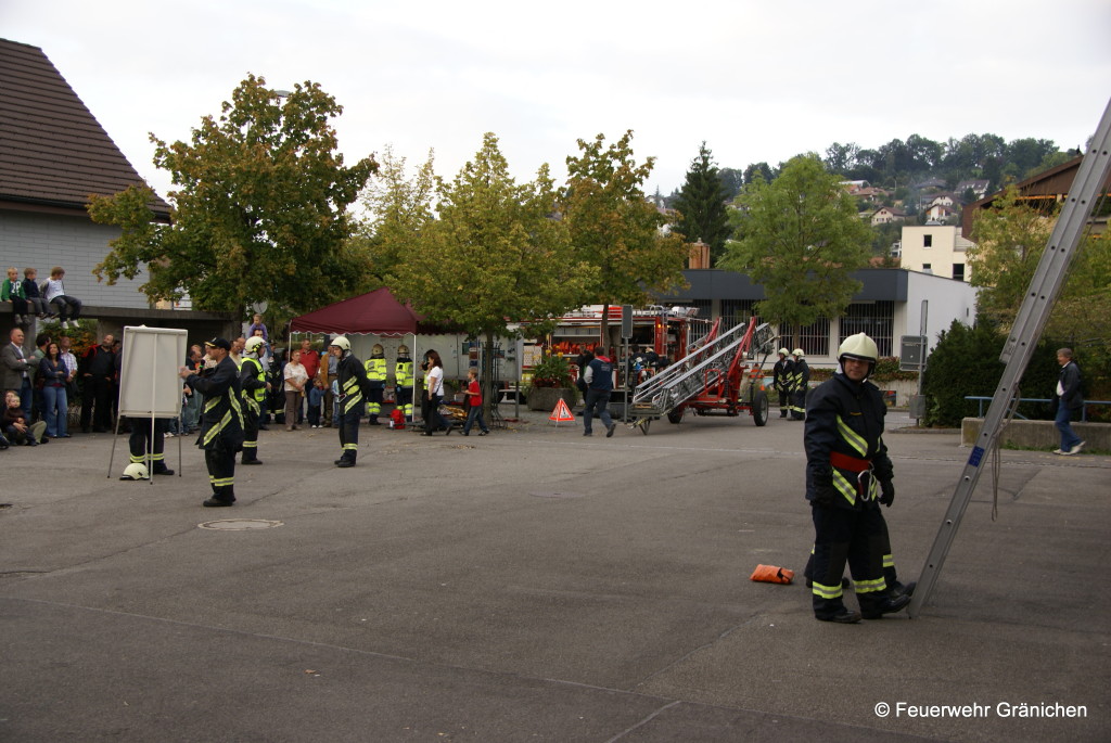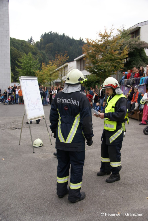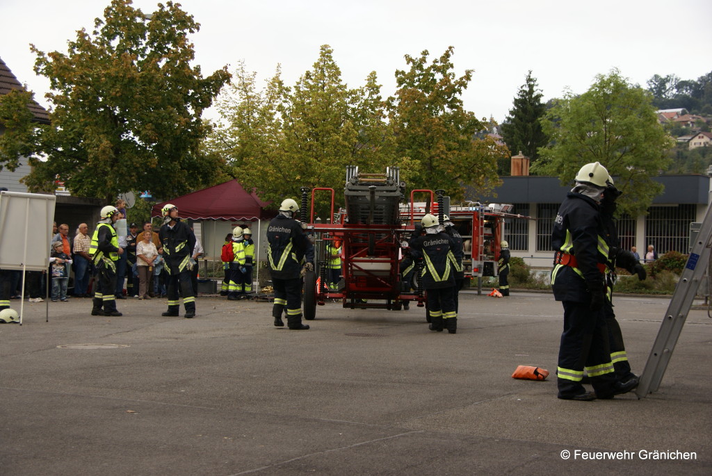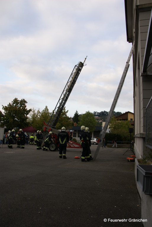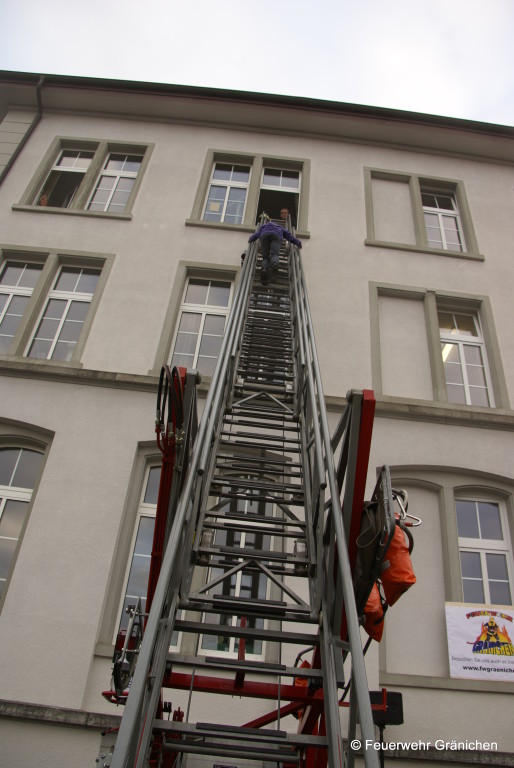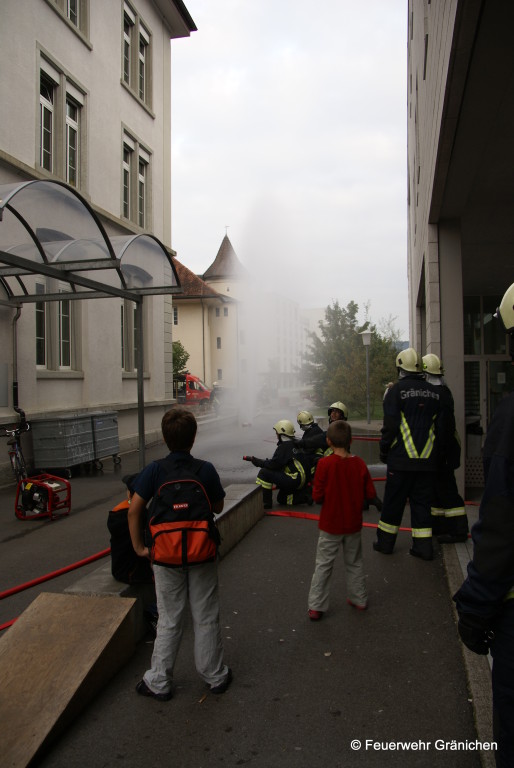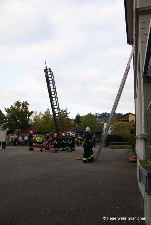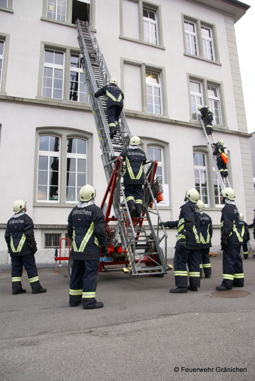 Zuerst wurden die Personen die im Rauch waren mit der 11 Meter langen Schiebeleiter gerettet. Weiter wurde die Schulklasse mit der 22 Meter langen Anhängeleiter mit Motor in Sicherheit gebracht. Alle geretteten Personen kamen anschliessend in das von der Sanitätsgruppe eingerichtete Verwundetennest. Dort wurden sie erstbehandelt und betreut. Derweilen sperrte das Verkehrskorps die Hauptstrasse einseitig ab und regelte den Verkehr. Es wurden mehrere Löschleitungen ab dem Tanklöschfahrzeug (TLF) erstellt und betrieben. Der Lüfter kam ebenfalls zur Rauchbefreiung des Gebäudes zum Einsatz. Zum Schutz von Nachbarliegenschaften setzte der Einsatzleiter das Hydroschild ein. Alle Aktionen wurden vom Speaker Schritt für Schritt erklärt. Die Feuerwehr verteilte den ZuschauerInnen feinen selbst gebackenen Speckzopf und frisch gepressten Apfelsaft.
