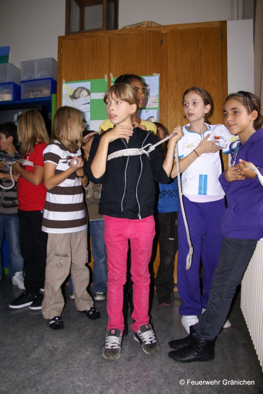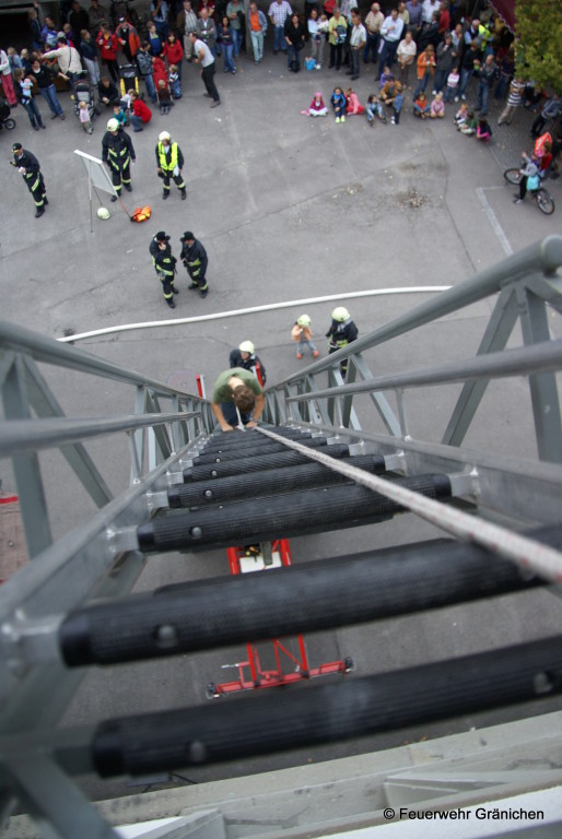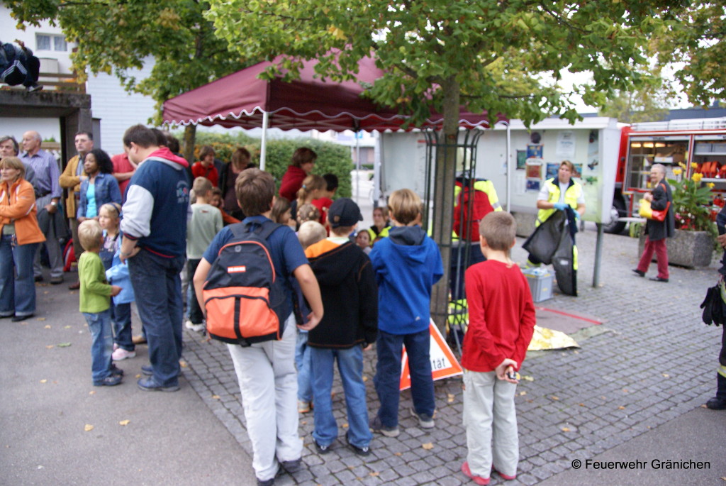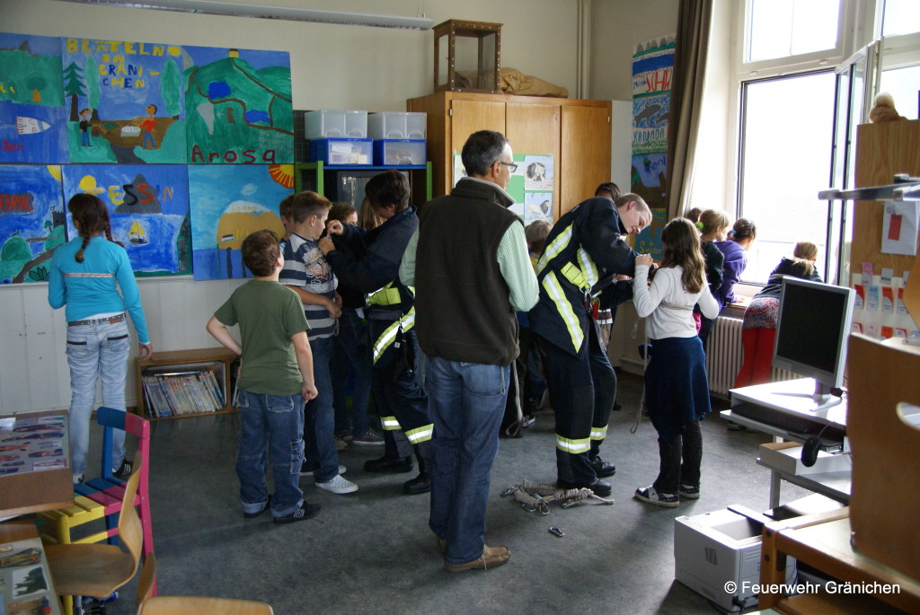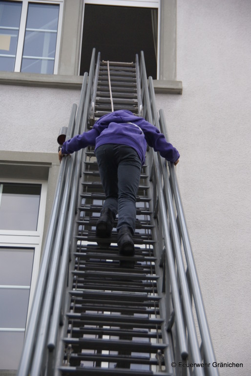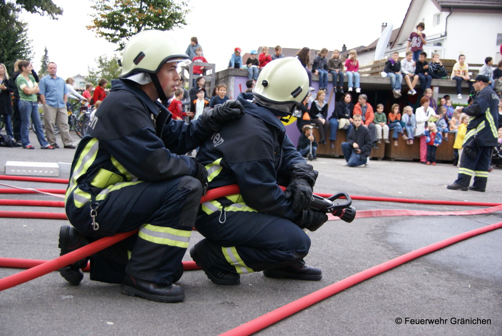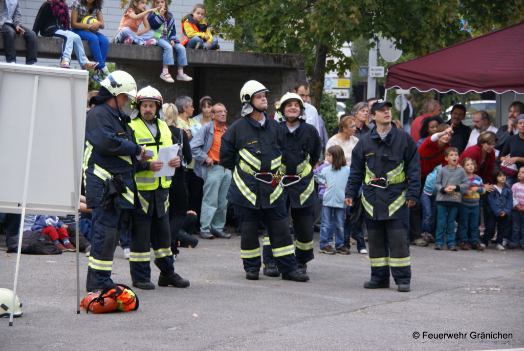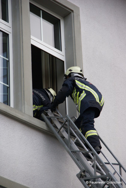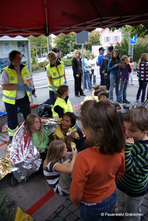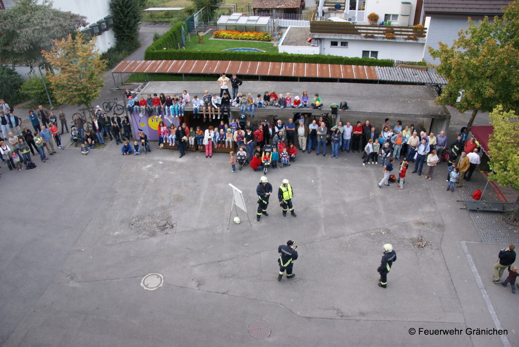 Zuerst wurden die Personen die im Rauch waren mit der 11 Meter langen Schiebeleiter gerettet. Weiter wurde die Schulklasse mit der 22 Meter langen Anhängeleiter mit Motor in Sicherheit gebracht. Alle geretteten Personen kamen anschliessend in das von der Sanitätsgruppe eingerichtete Verwundetennest. Dort wurden sie erstbehandelt und betreut. Derweilen sperrte das Verkehrskorps die Hauptstrasse einseitig ab und regelte den Verkehr. Es wurden mehrere Löschleitungen ab dem Tanklöschfahrzeug (TLF) erstellt und betrieben. Der Lüfter kam ebenfalls zur Rauchbefreiung des Gebäudes zum Einsatz. Zum Schutz von Nachbarliegenschaften setzte der Einsatzleiter das Hydroschild ein. Alle Aktionen wurden vom Speaker Schritt für Schritt erklärt. Die Feuerwehr verteilte den ZuschauerInnen feinen selbst gebackenen Speckzopf und frisch gepressten Apfelsaft.