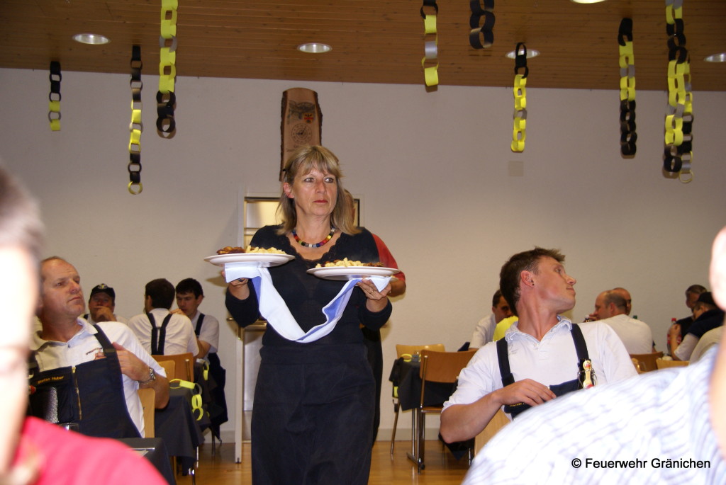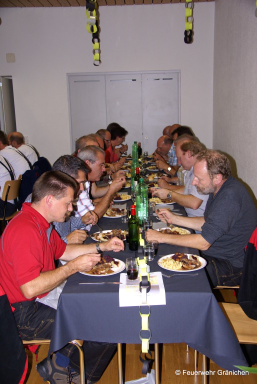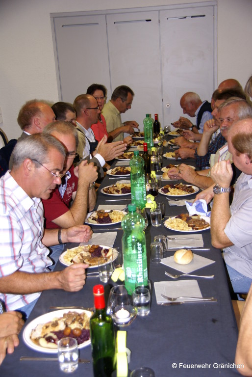 Die Cady Crew servierte uns wiederum ein feines Nachtessen. Just zu Beginn der Ansprache des Kommandanten René Lüscher, kam der Feueralarm von der Brandmeldeanlage der Landwirtschaftlichen Schule Liebegg. Vier Offiziere nahmen eine Kontrolle vor. Zum Glück war es ein Fehlalarm. So konnten alle den Abend gemütlich ausklingen lassen.